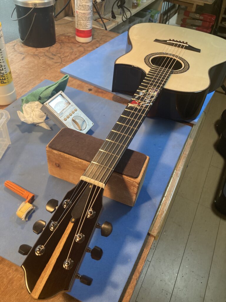 三木楽器様に200周年特別仕様のギター SMALL-D Oni-Fudaを納品させて頂きました。今回このギターのサイドバックに使用したアフリカンブラックウッドを眺めているといつも雨を感じるんです。Ogawa Inlay さんに鬼札をテーマにした素晴らしいインレイを入れて頂きました。